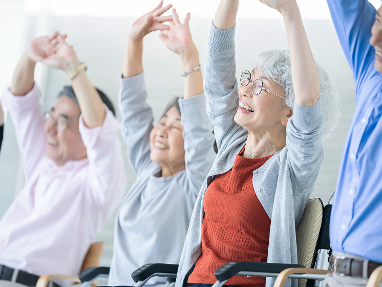 理学療法士などの専門職が、ひとり一人の状態や目標に合わせて無理なく続けられる、効果的なプログラムをご提案いたします。また、1日2回の集団体操プログラムにて、みなさんで体を動かします。